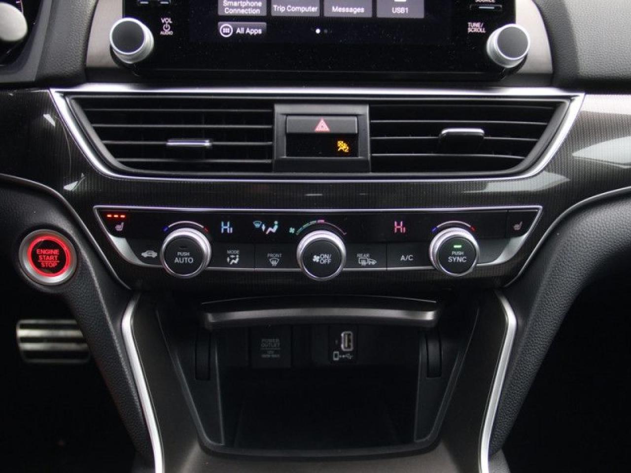 Our Accord Sedan's trim level is Sport 2.0. The Sport trim adds some excitement to this well-appointed sedan. It comes with a lip spoiler, fog lamps, 19-inch aluminum wheels, a power sunroof, an AM/FM radio with Android Auto and Apple CarPlay, Bluetooth, a USB input, 10-speaker premium audio, collision mitigation braking, lane keeping assist, a rearview camera, leather/fabric seats which are heated in front, dual-zone automatic climate control, and more.